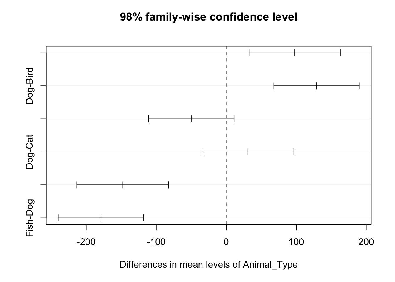 From top to bottom, this figure presents confidence intervals for the following pairwise comparisons: cat-bird, dog-bird, fish-bird, dog-cat, fish-cat, and fish-dog. The family wise confidence level is 97.5% because comparisons concerning pet type all have an alpha value of .025. The confidence intervals for the cat-bird, dog-bird, fish-cat, and fish-dog comparisons do not cover zero, meaning this analysis suggests 97.5% confidence of these pet groups possessing different prices from one another throughout Colombo, Kandy, and Gampaha. Since the dog-cat and fish-bird comparisons cover zero, there does not appear to be a significant difference among both pairs of pet price averages throughout Colombo, Kandy, and Gampaha. Both of these sets of comparisons suggest there is an overall difference in price between mammalian pets and non-mammalian pets among the residents of Colombo, Kandy, and Gampaha, which corresponds to people in all three cities assigning differents levels of value to mammalian and non-mammalian pets. It is also possible that dogs and cats, as the most popular pets worldwide, have significantly higher prices in Colombo, Kandy, and Gampaha than all other pets, including other mammalian ones. In order to determine which hypothesis is accurate, however, more analysis would need to be conducted. Based on this analysis, an appropriate model for predicting the prices of pets in Gampaha, Kandy, and Colombo should consist of the average pet price per species of pet.